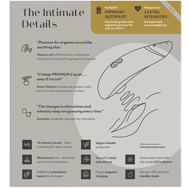 ボタンを押さなくてもお肌に触れるだけで吸引できるタッチセンサーを搭載!あのウーマナイザープレミアムがバージョンアップした「ウーマナイザー プレミアム2 (グレー)」。 吸引強弱機能は12から14段階へパワーアップ!パイロットモードを搭載することで、ボタンの操作をしなくてもウーマナイザーが吸引の強弱を自動でコントロールしてくれます。 振動は弱・中・強の3段階!予測できない楽しみを味わいたいという人はもちろん、カップルさんで使うときにもこれらの機能は大活躍♪ボタン操作に慣れていない方でも感覚的にお楽しみ頂けます。 素材はシリコン/ABS樹脂で2時間のフル充電で連続4時間の使用が可能です。