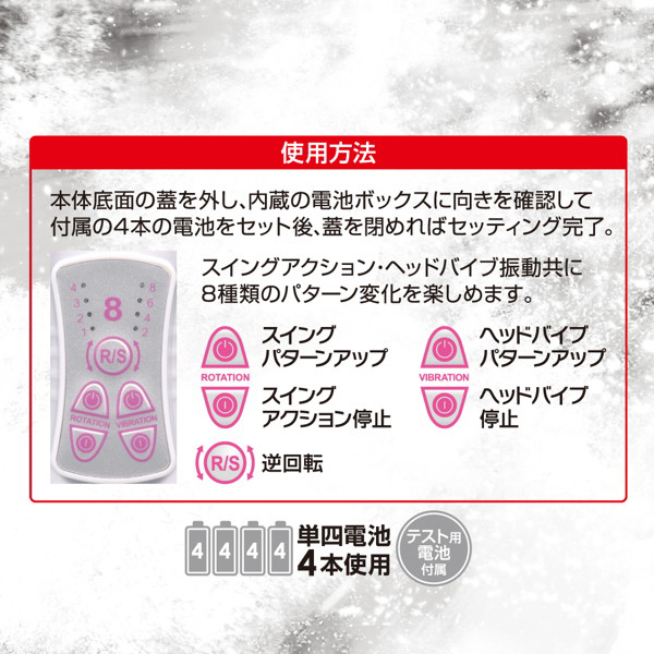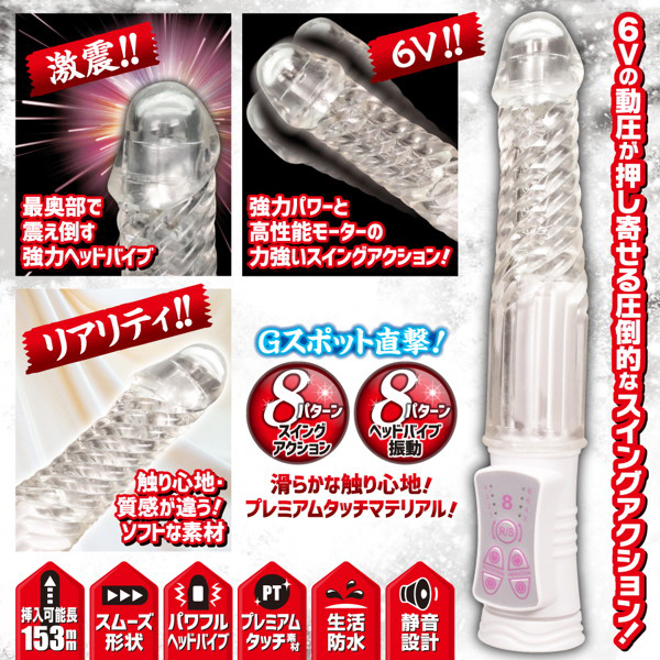 6Vの激震がGスポ直撃!中イキ派唸る悶絶必至の電池式バイブ(白)。 内蔵された高性能モーターが繰り出すハイパワー振動!8種類のスイングと振動パターンに加えて、刺激の変化をもたらすリバース機能で飽きの来ない多彩なアクションが楽しめる♪挿入可能長は153mm、滑らかで触り心地の良いプレミアムタッチ採用!最奥を徹底的に責め立てるストレートバイブ。 単4電池×4本使用 |