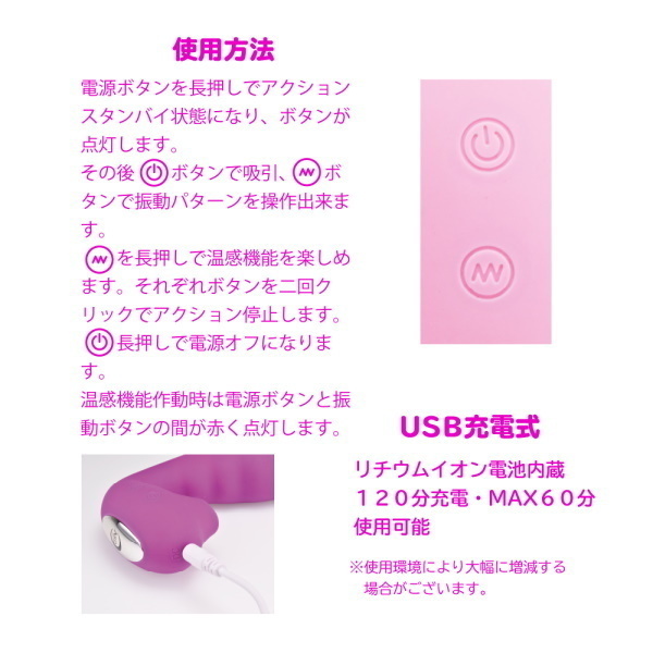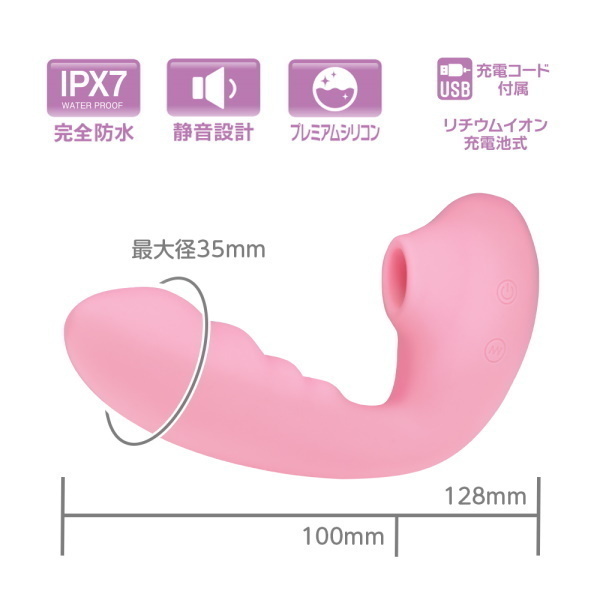 SNSで話題の<吸うやつ>吸引しながら振動を楽しめるくの字形状に温感機能搭載でリアリティUP!振動部分の形状や太さにもしっかりと拘った納得のアイテムです。 しかもIPX7の完全防水性能設計だからしっかり洗えて水場での使用も問題ありません。 120分充電で最大60分使用可能●カラー:ピンク |