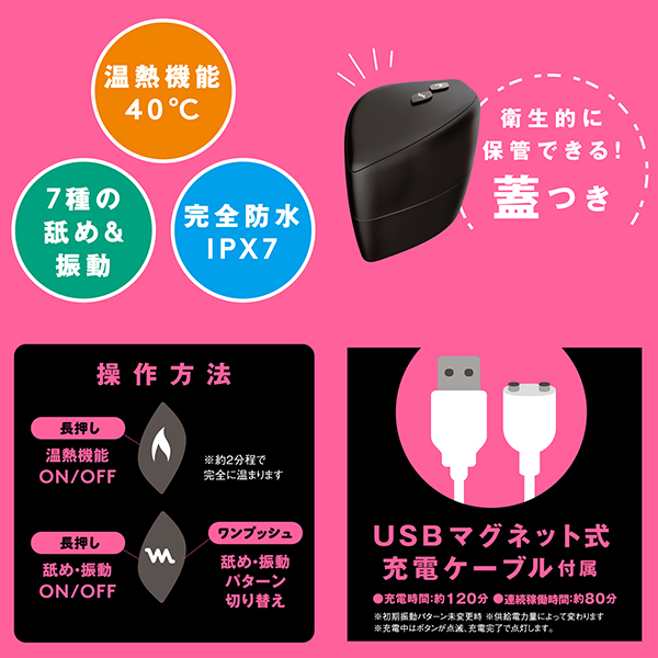 アツくて甘〜い愛のご奉仕クンニ_超!愛を感じる舐めローター!彼の熱い舌を思い出す温感機能は40℃まで温まる人肌温度_先っぽで刺激するチロチロクンニからグイグイ舐め上げる激しいクンニまで多彩なクンニが楽しめちゃう_さらに7パターンの振動機能付き!震えるあったかベロでとろける濃密前戯_やっぱりクンニがナンバー1!!!完全防水なので使用後のお手入れもラクチン♪敏感な部分に直接使うものだから、優しい肌あたりの高品質ソフトシリコンを使用しました。 衛生的に保管できる蓋付きです。 振動・舌舐め:7パターン&完全防水IPX7等級&充電用USBケーブル付属。 カラー:ブラック |