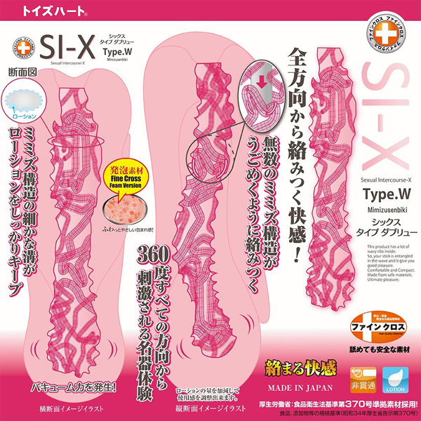 全方向から絡みつく触手の快感が超気持ちいい!一度使うと手離せなくなるほどハマっちゃう極上オナホール。 ●シックス・タイプ「W」ver●ふわっと優しく包み込む発泡素材を採用●内部:360℃配置した無数のミミズ千匹構造●細かな溝がローションをしっかりキャッチ●バキューム力も抜群●日本製・ローション付き。 挿入直後から無数の触手がどこまでも絡みついてくる刺激たっぷりのオナホールです。