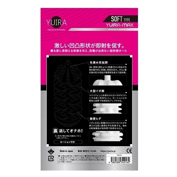 裏返してオナホ!あの人気商品とYUIRAのコラボ実現!簡易オナホがソフトバージョンで新登場!ハードと違い、やわらか素材でアナタを優しく包み込みます♪<選べる3タイプ><安心の日本製><ローション付き>激しい凹凸形状が即射を促す、摩る度に身悶える刺激を与え、我慢が出来ない超快感ホール、先責め突起群、360度取り囲むように配置された突起が先端を集中刺激。 最先端の巨大突起が敏感部を捉え超快感。 大型イボ群、コリコリイボによりピストン運動する度に気持ちいい。 ローションとの相性も抜群。 絶壁ヒダ−イボとクロス配置されたそそり立ちヒダが何度もち〇ぽを刺激する。 強烈刺激構造により短時間でフィニッシュ。