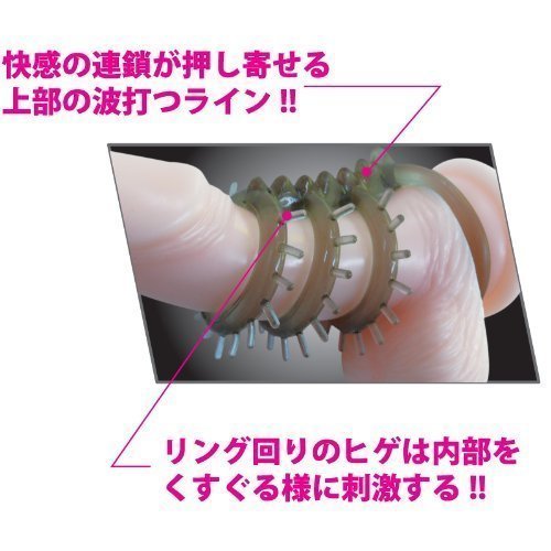 新しい刺激と快感に出会える!男根をしっかりと締め付け、持久力アップを強力にサポートする4連リング仕様の男性補助グッズ。 タイプBは上部3つのリングに付いたトゲが、くすぐるように刺激を与える特殊形状!さらに連結部分の波形状が相手の敏感なところを責め立てます。 また、リングを玉袋に通すか通さないかで体感する刺激が変化!いつもと違う快感と持続力で、貴方の日常を変えるペニスリングです。