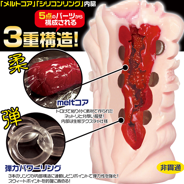 肉厚の外壁&トロトロ膣内素材の間に、3つのリングを内蔵した新発想のオナホール。 肌色の側面にもビラビラを刻み込み、ちょっとしたグロさをアピール!膣括約筋・Gスポット・ポルチオにある、3つのパワーリングの弾力で、まるで三段俵締めの名器のような吸い付き&締め付けを味わえる、非貫通型・無次元オナホールです。 ペニスが欲しくてたまらず、欲情しちゃったアソコをご堪能ください! |