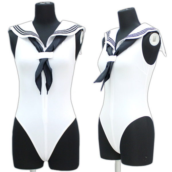 大人気のセーラー服とレオタードが合体!セーラー襟+スカーフ付きセーラーレオタード「セーラーノースリーブレオタード 白 BIG」。 襟とスカーフの紺色をアクセントにした爽やかな白ベースのノースリーブレオタード。 深めのハイレグ&ハーフバック、ぴちっとしたフィット感がクセになるので、拘束用としても良さげなレオタードです。 フロントファスナーは前開きの大胆仕様で着脱も簡単!スキッパー風にもセクシーな露出スタイルにもアレンジが可能です。