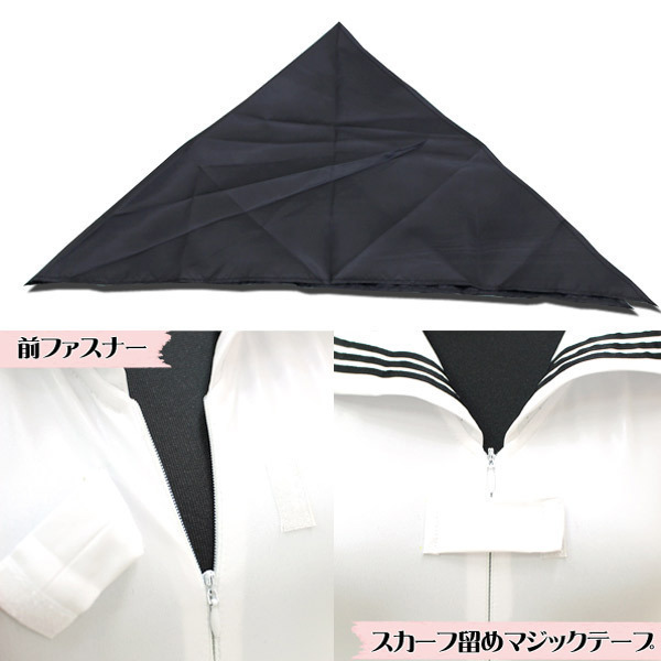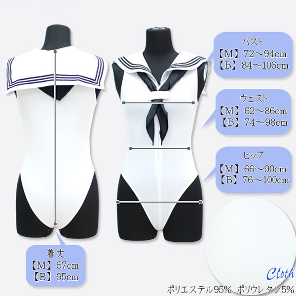 | ■ 仕様 | BIGサイズ:B84〜106cm・W74〜98cm・H76〜100cm 着丈65cm セット内容:レオタード(前ファスナー)、スカーフ(マジックテープ) 素材:ポリエステル95%、ポリウレタン5% セーラーノースリーブレオタード 色:白 |