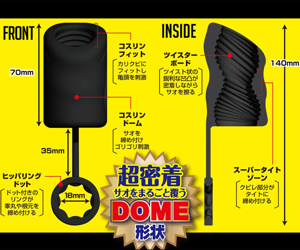 あのコスリングがパワーアップして帰ってきた!手コキ以上の快感×オナホ以上の衝撃が押し寄せる…ッ!新感覚オ〇ニーグッズ第2弾!!睾丸や根元を締め付けるリングはドット付きに進化し早漏防止&勃起力UP!!竿をまるごと覆う超密着なDOME形状が全体を包み込みハードに締め付ける!ツイスト状の凹凸がゴリゴリと責め、内部のクビレ部分が単調ではない刺激を生み出します。 自由に擦るだけで最高の射精感、まさにストライクな一撃!普通の手コキでは得られない圧迫感、オナホの煩わしい後処理にサヨナラ! |