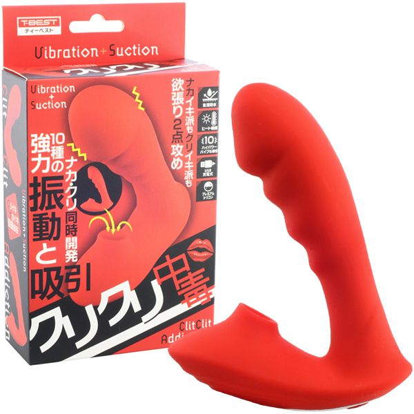 これさえあれば中イキ派もクリ派も大満足の欲張り2点攻めバイブ「クリクリ中毒」。 リアル形状の先端が挿入感をしっかり感じさせながら波打つ挿入部が腟内をしっかり振動してくれます♪クリ吸引も強力でハイパワー!クリトリスを攻め立てながらGスポットも刺激する2点攻めで快感も最高潮♪10種類の強力振動と吸引機能でナカも外も同時に開発しながらイカせてくれます。 ぬくもりを感じるヒート機能を搭載しているので寒い日でも冷たくなく、人肌の暖かさで挿入感がよりリアルに感じられます♪高級シリコンを使用しているので肌触りも最高。 生活防水仕様なのでご使用後はしっかり水洗いが出来ます♪電源はUSB充電式でフル充電120分で連続稼働120分です。