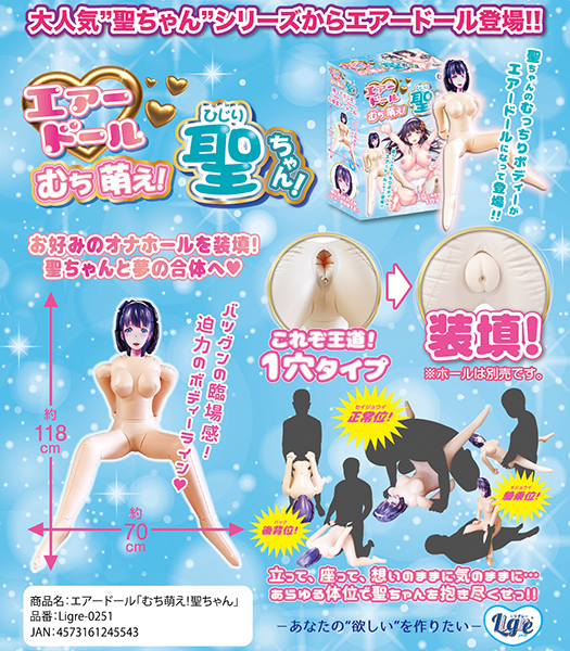 超リアルエアドール「むち萌え!聖ちゃん」の登場です!匂い系グッズで人気の、聖(ひじり)ちゃんがエアドールになりました♪むちむちのボディで恥ずかしそうな聖ちゃんの笑顔がたまらない!顔全体がしっかりと違和感なく収まっていて凛々しいエアードールへと仕上がっています♪空気を注入すると後ろ手にM字開脚したポーズになり、王道の1穴タイプでお好きなオナホを装填したら、いざ聖ちゃんと合体へ!体位は正常位からバック、さらには斜めに交わる事も可能でホールは小型から中型ぐらいまでなら装着可能♪肌はビニールっぽくない触り心地で少しマットな感じもグッド!蕩けそうな恥じらいフェイの可愛い聖ちゃんをたっぷりと体感してください♪浮き輪を作っている工場制作なので、頑丈で安心ですよ! |
